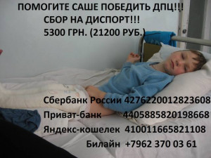 Во - первых, наш постоянный помощник из г. Запорожье пообещал оплатить Сашино лечение в Трускавце. Поэтому сумма к сбору уменьшается в разы. Теперь остался только Диспорт. Спасибо большое нашему дорогому Александру за такую важную и такую необходимую для Саши помощь. Еще раз убеждаюсь, что мир не без добрых людей, а тому, кто стучится, всегда открывают двери.